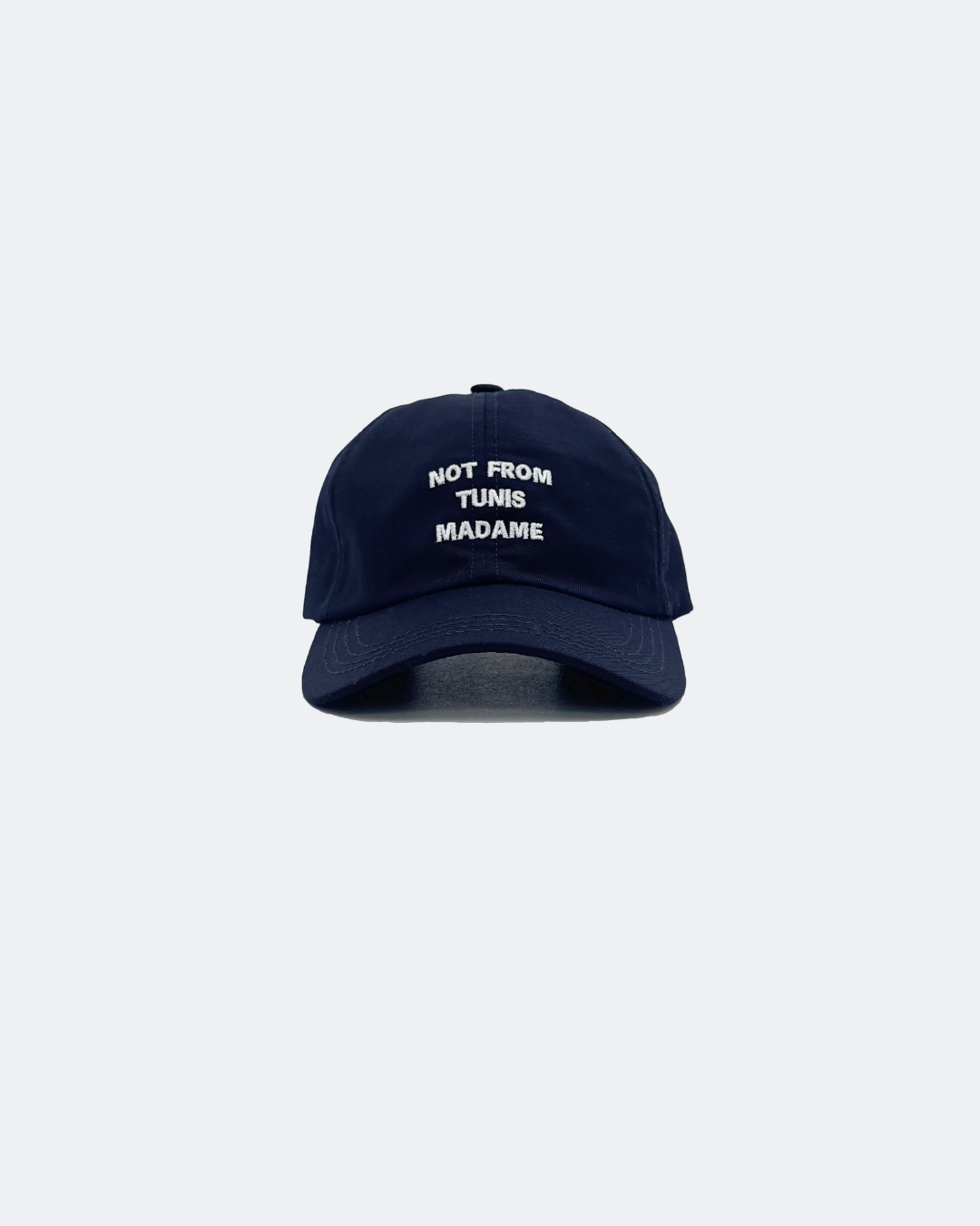 This 6-panel baseball hat is embroidered with the ‘Not From Tunis Madame’ slogan on the front, featuring an adjustable metal buckle at the back.