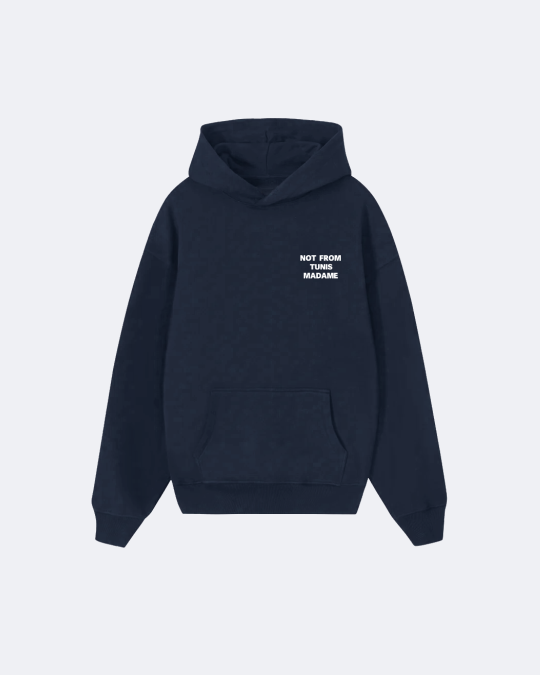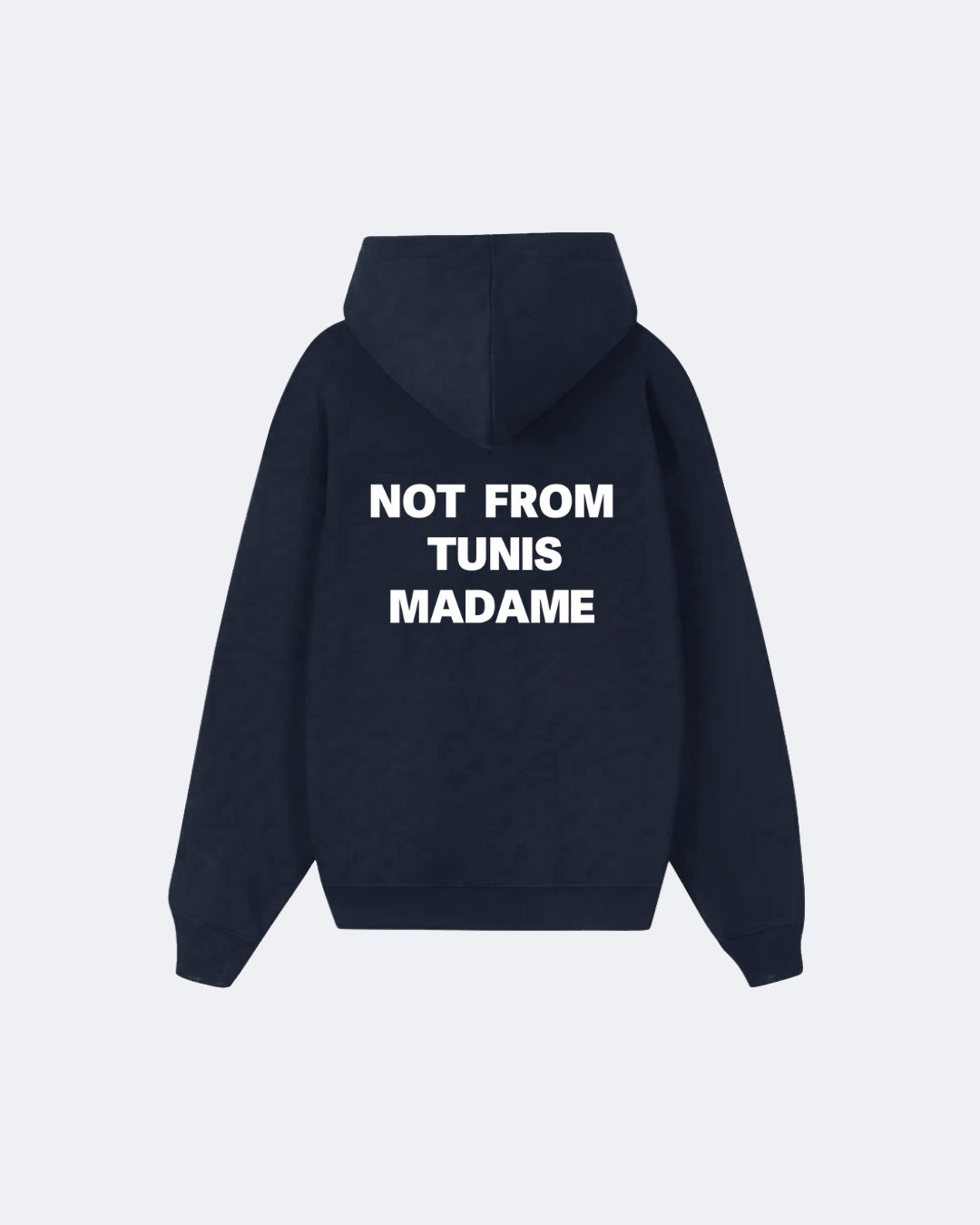 Introducing Le Hoodie “Not From Tunis Madame” in Nighty Blue Crafted from 420 GSM heavyweight 100% cotton French Terry with a brushed interior, delivering a soft and lived-in feel while maintaining structure.