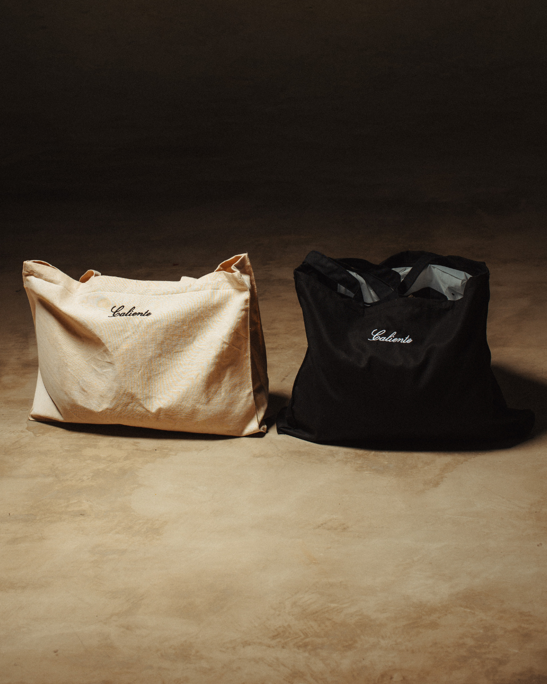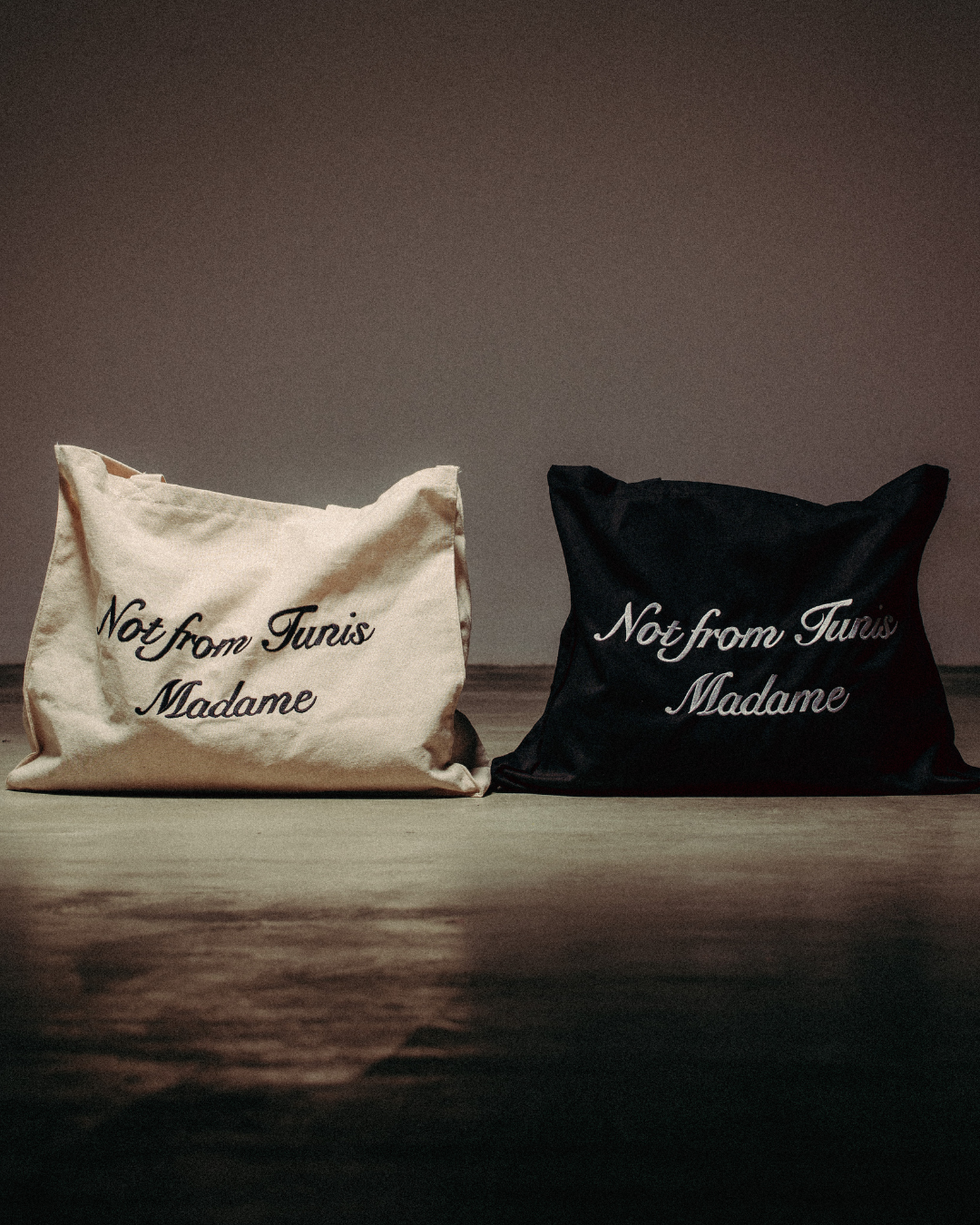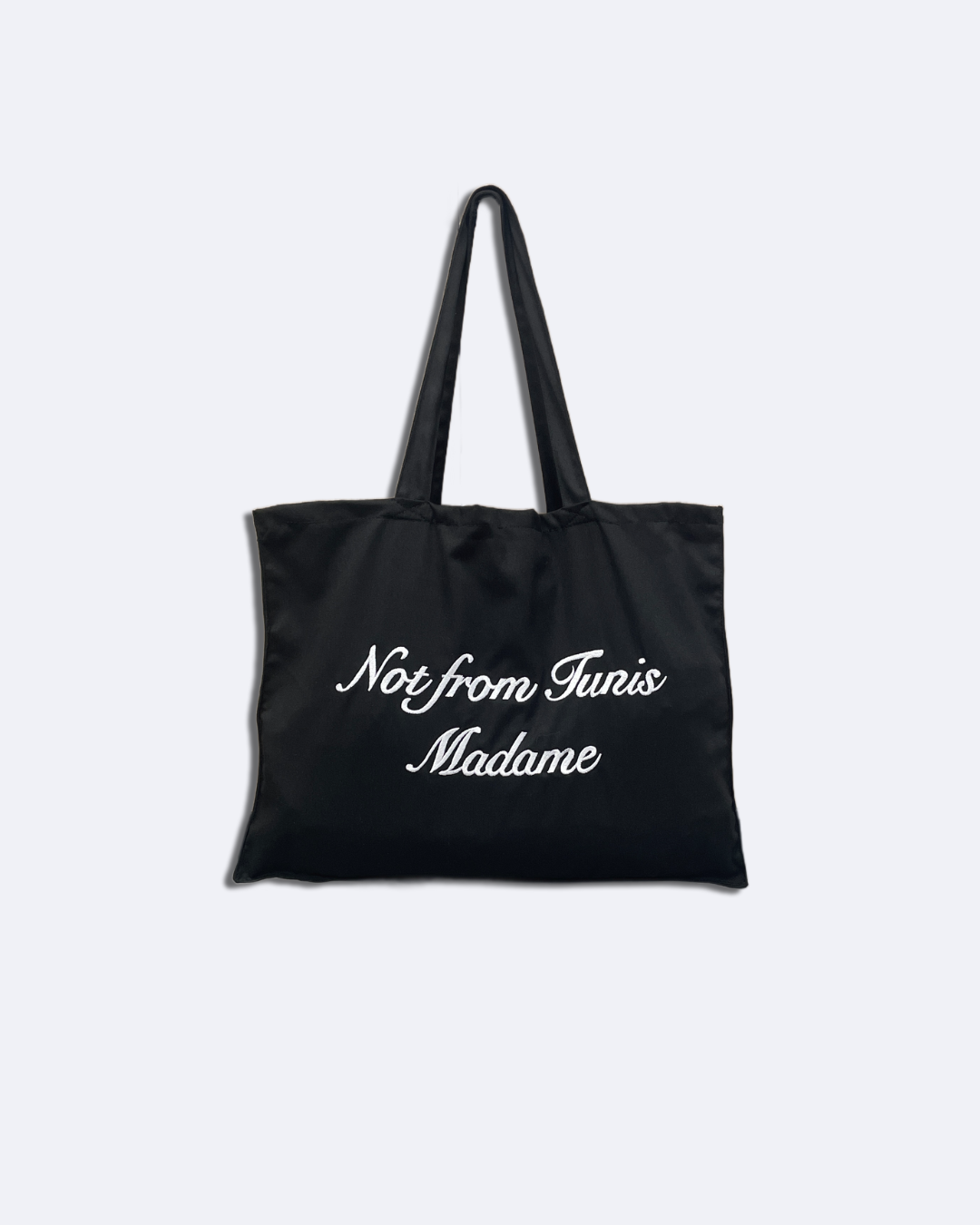 Black Canvas tote bag featuring Not from Tunis Madame script embroidery at front, Caliente script embroidery at back & Inner zipper pocket. Durable, and naturally textured for everyday wear and tear.